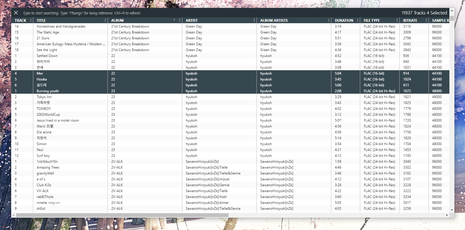 seiri is a music manager designed for large libraries (10000+ tracks). The manager was created to be opinionated. It organizes music in one way and has few customizable options. seiri's features are constrained to keep large libraries of music consolidated and searchable. seiri depends on how files are organized in folders, and ignores music players and song tagging tools. seiri works best with music players that disregard where music is stored, such as foobar2000.