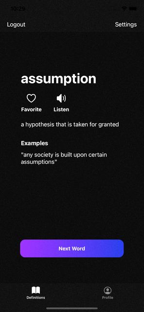 This app helps the user improve their vocabulary in an engaging manner by providing the user with random words and their details in addition to allowing the user to practice their knowledge of these words through word games and challenges.