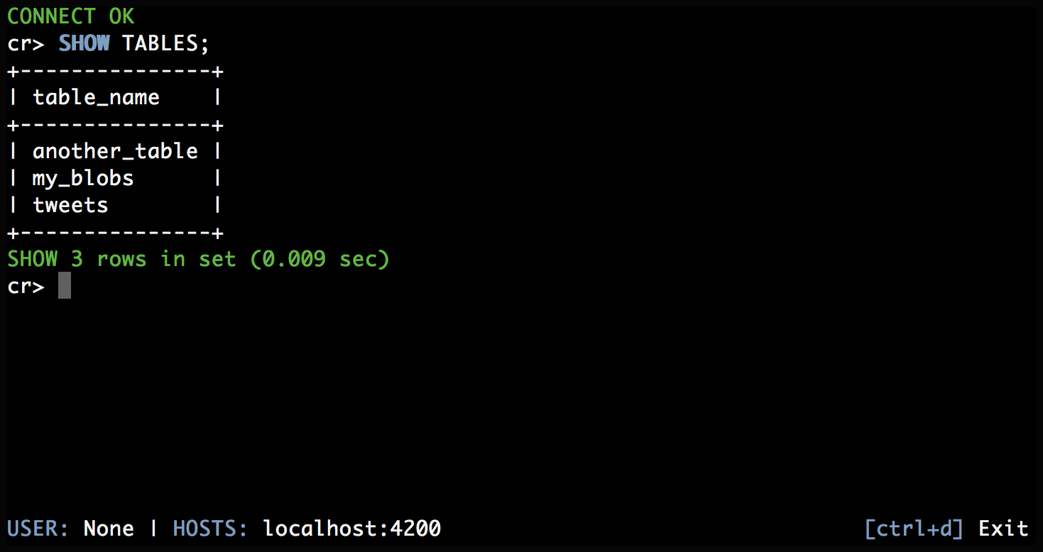 The CrateDB Shell (aka Crash) is an interactive command-line interface (CLI) tool for interacting with CrateDB.