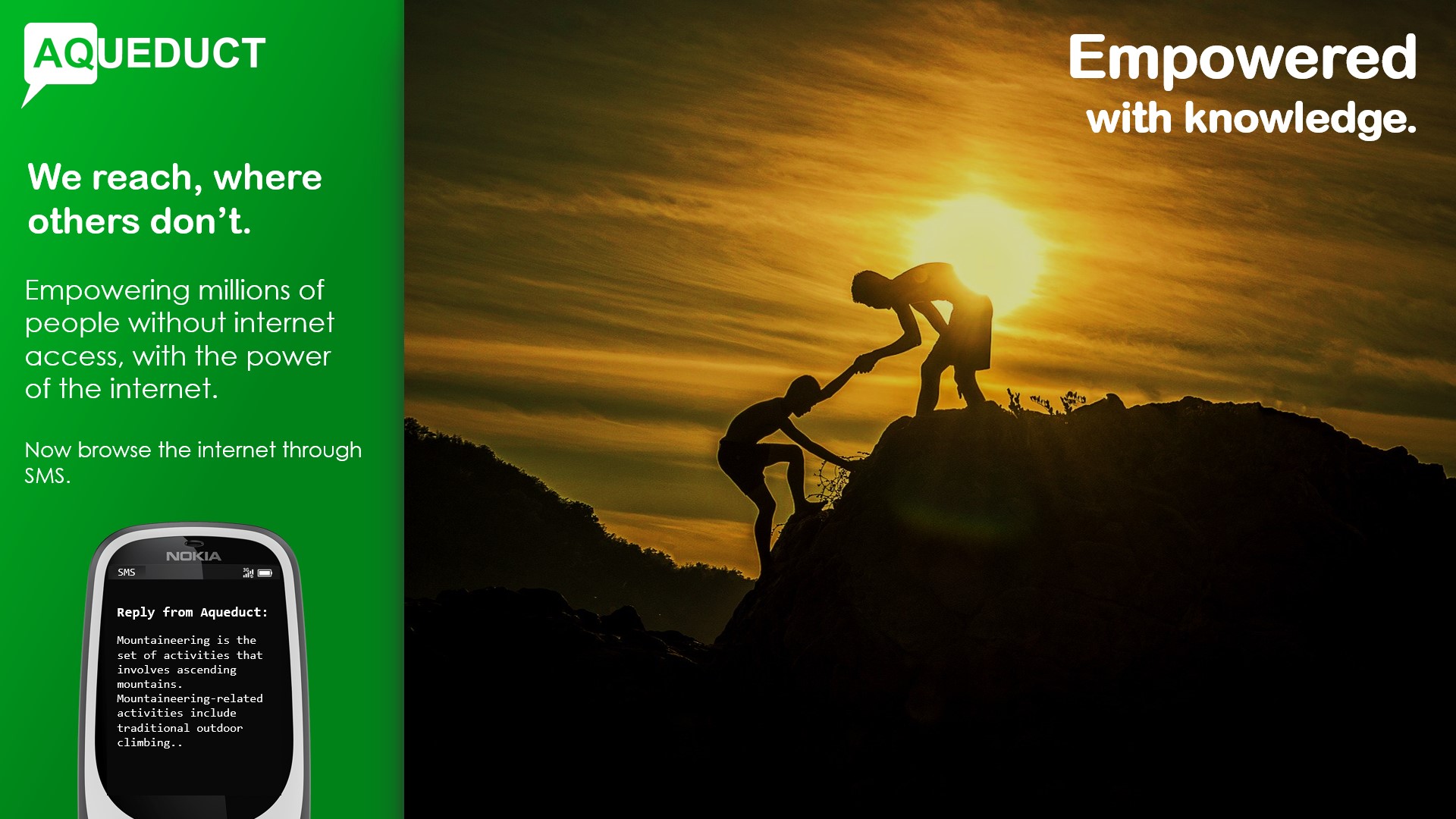 Aqueduct is a SMS-based chatbot designed to bring internet access to areas with little or no internet infrastructure. The service is primarily aimed at users of feature phones.