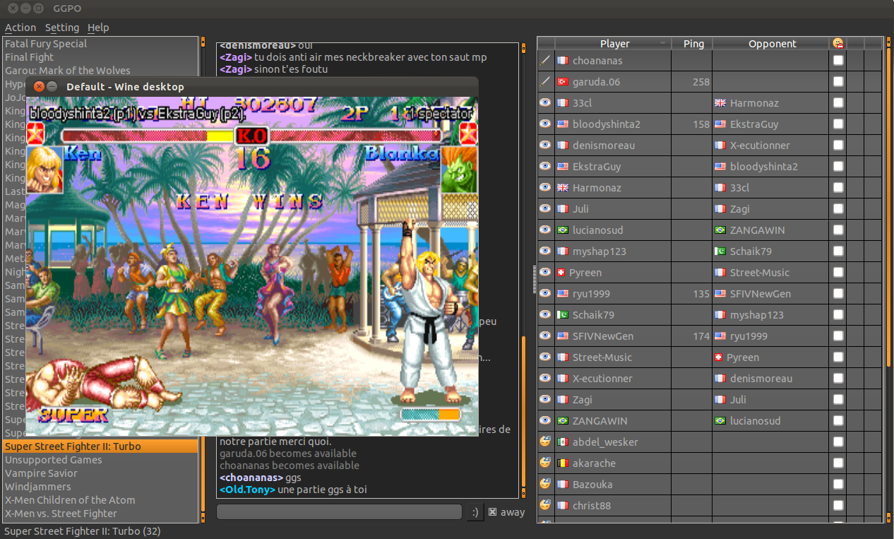 winecfgand check the option to "Emulate a virtual desktop" cd pyqtggpo ; python main.py- Login with your ggpo credential