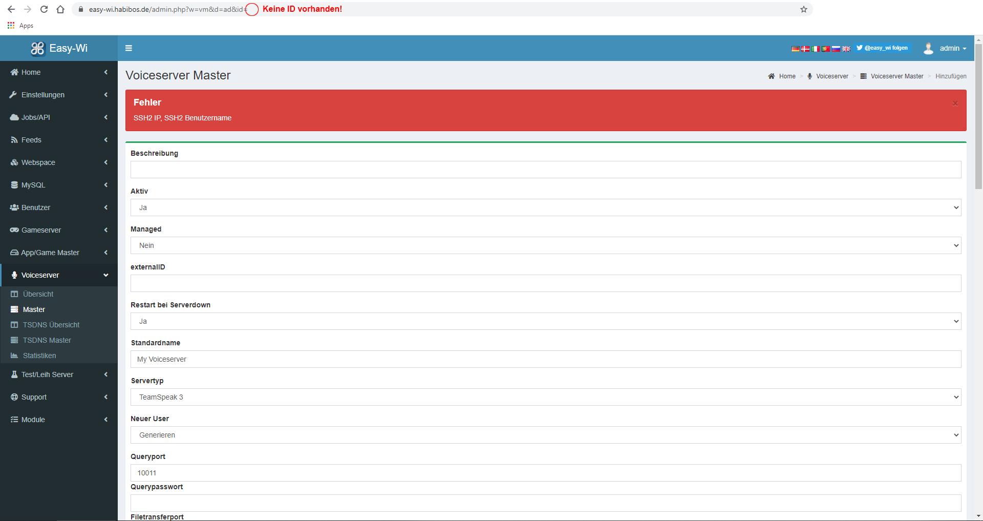 Beim hinzufügen eines Voiceserver Master gibt es Probleme bei der Formular validierung. Wenn man dort Eingeben macht und das Formular nicht erfolgreich abschicken kann. Dann wird man auf die URL admin.php?w=vm&d=ad&id= weitergeleitet sprich es fehlt eine ID. Die es ja auch noch nicht geben kann, weil der Datensatz ja nicht angelegt wurde. Dies ist allerdings sehr unschön weil man die Daten jedes mal neu eingeben muss. Das ganze wurde beim Game Master Module auch genau so umgesetzt und sollte auch beim Voiceserver Master Module funktionieren.