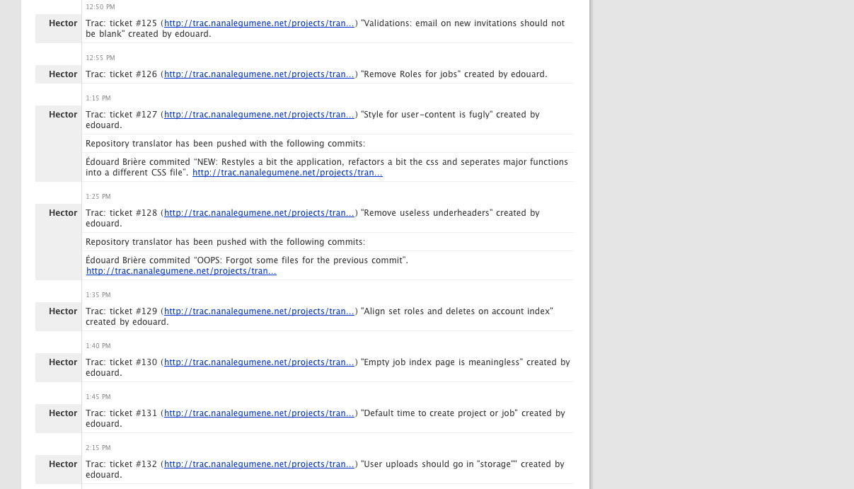 If you’d rather use IRC instead of Campfire you might want to try out the handy irccat which is notoriously used by the Last.fm development teams instead. This Campfire plugin is actually only a slight change from the irccat trac plugin.