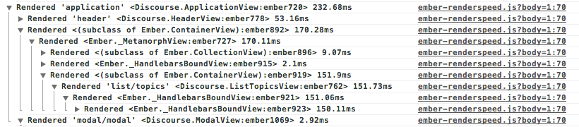 Include the script in your Ember.js project. Open your developer log and you'll see a nice expandable graph of rendering speeds: