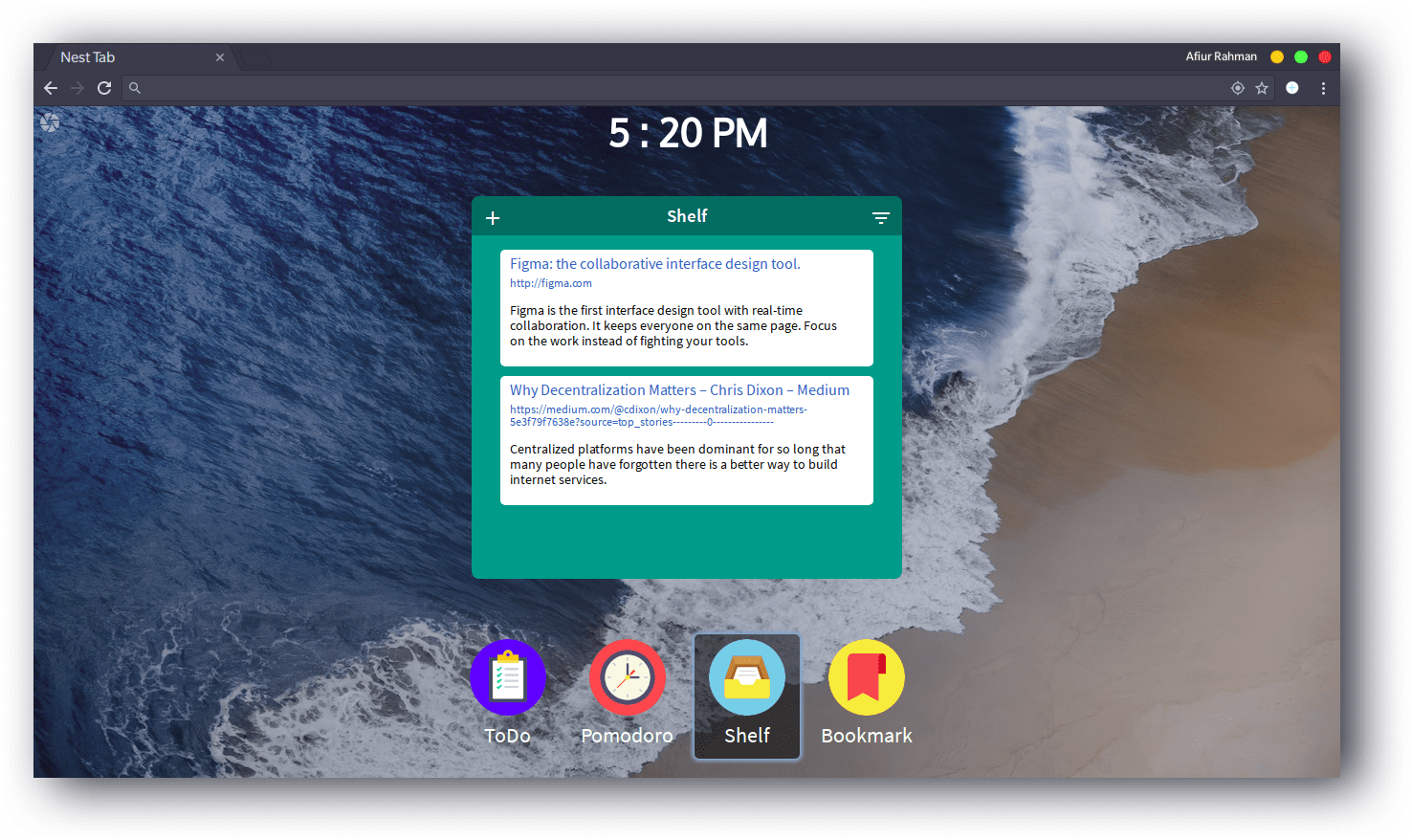 - A Shelf where you can leave url for visiting at a later time. Shelf attemps to collect metadata of your url to keep things organised.