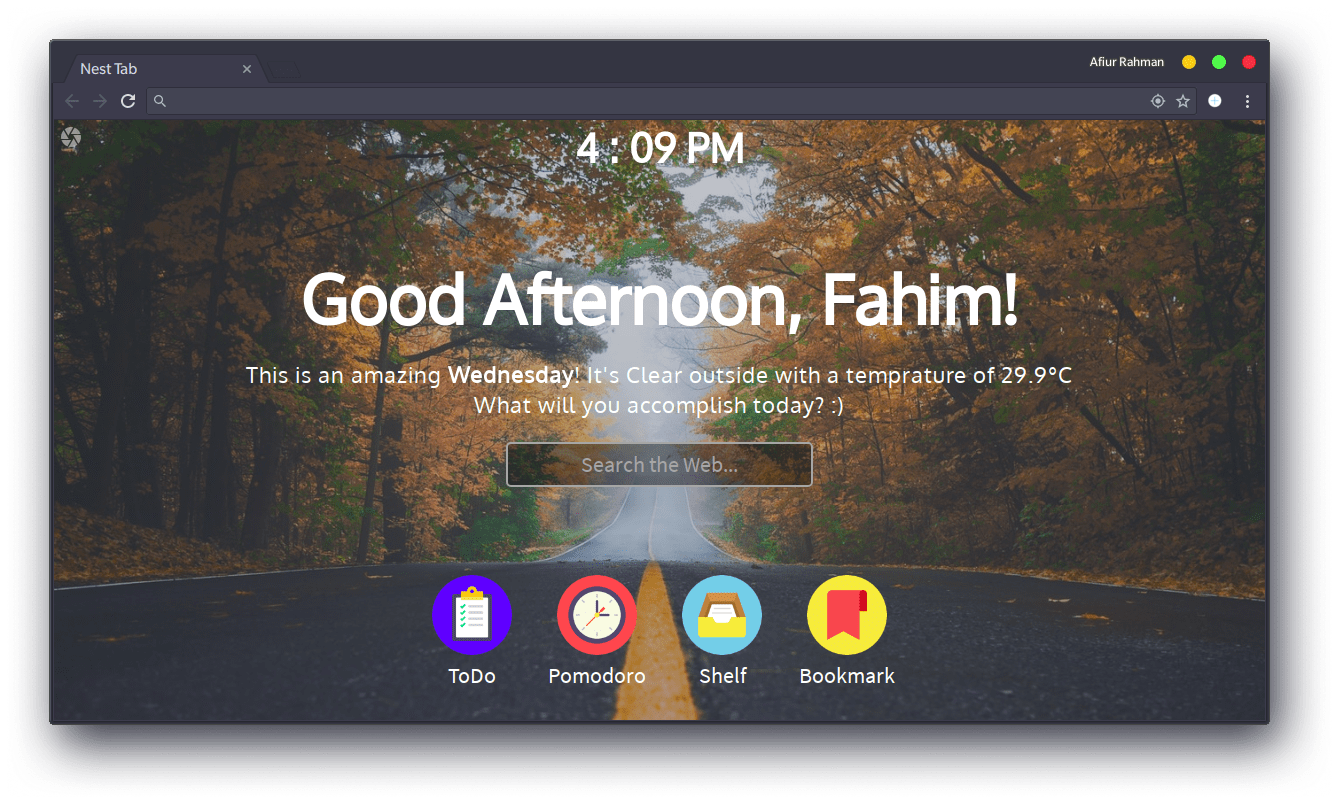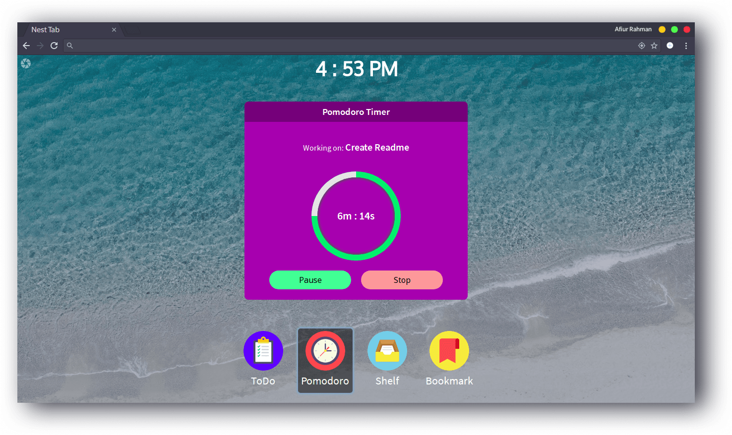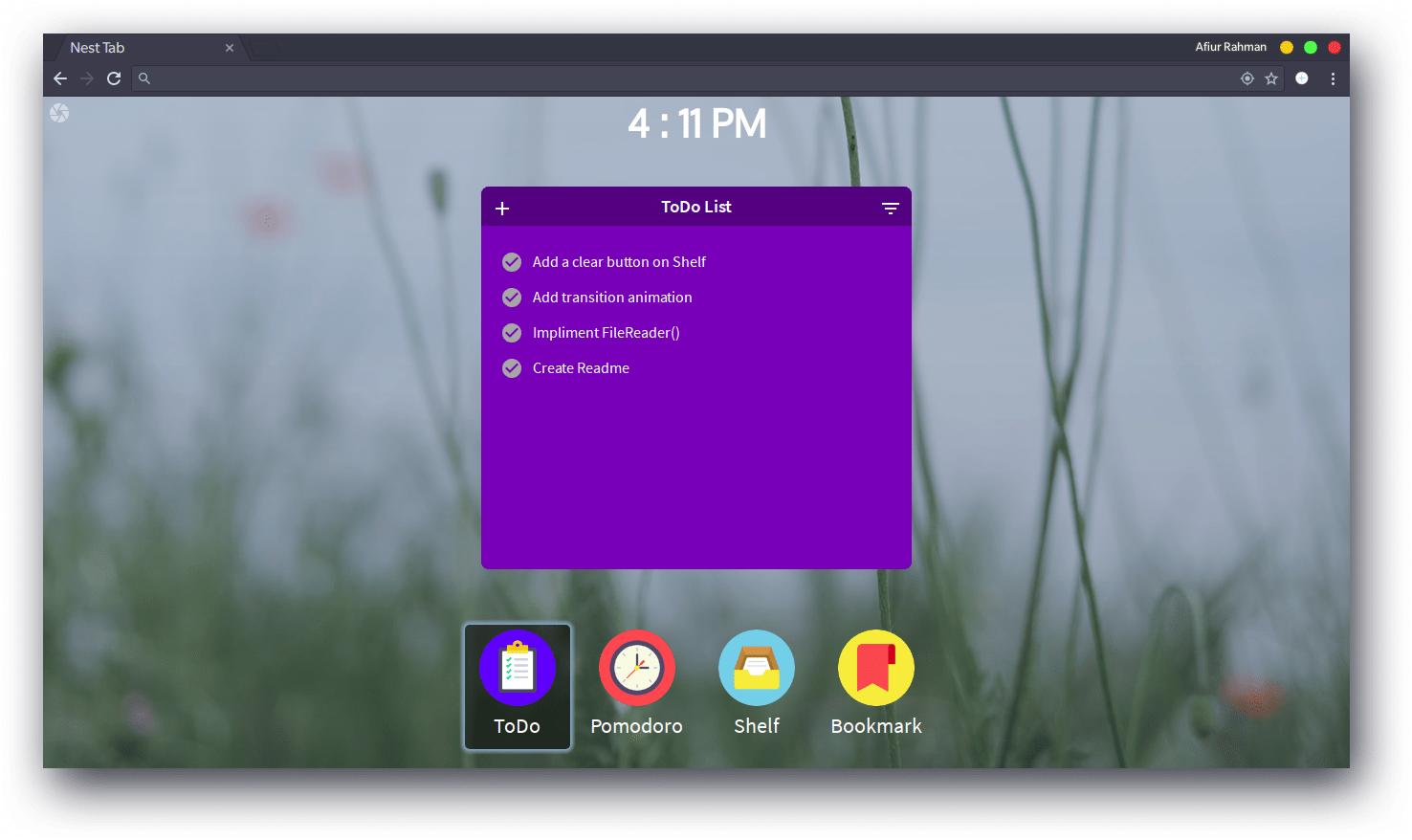 Nest Tab is a simple Google Chrome extension that replaces your New Tab page with a clean looking page that contains tools to help you be productive. Simplicity and usefulness is the main focus of Nest Tab. It currently features a Todo list and a Pomodoro clock that works together, a Shelf to dump urls that you want to take a look at later, and a Bookmark quick acess tool. More features are to be added soon. This project was built as part of the Chingu Build to Learn program.