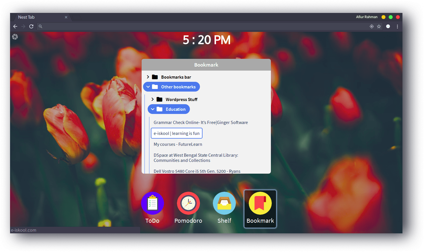 - A Bookmark browser that lets you browse all your saved bookmark in quick and easy way and also open them in a new tab.