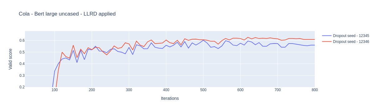Here is the result of the same model but with LLRD applied on the CoLA dataset. Here you can see that the model has diverged quite a lot by applying LLRD. Therefore as we discussed earlier their is no universal remedy yet but some techniques work well on some datasets