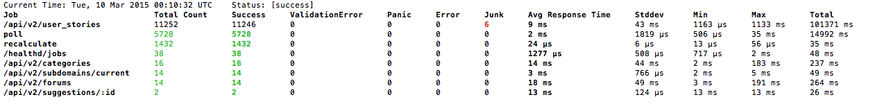 stream.EventKv("starting_app", health.Kvs{"listen_ip": listenIP})We've built a set of tools to give you New Relic-like application performance monitoring for your Go app. It can show you things like your slowest endpoints, top error producers, top throughput endpoints, and so on.