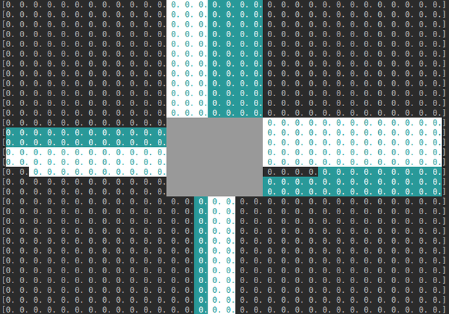 The intersection defined in the sumo network configuration is represented as a 1 or 0 valued matrix. An example of how an agent see the environment shown below.