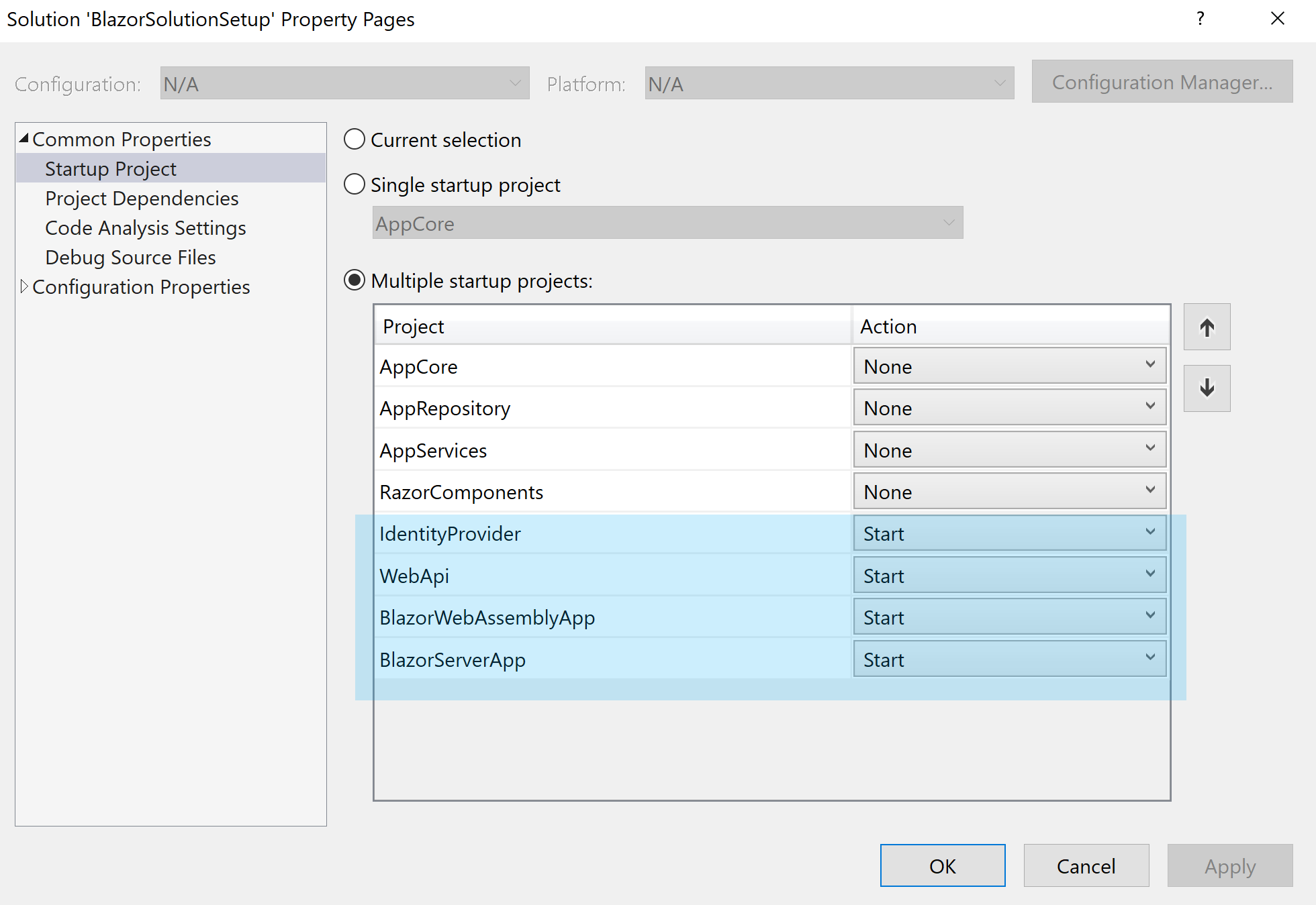 }9.1. In the solution's properties window select Multiple startup projects and set the Action of the following projects to Startup: