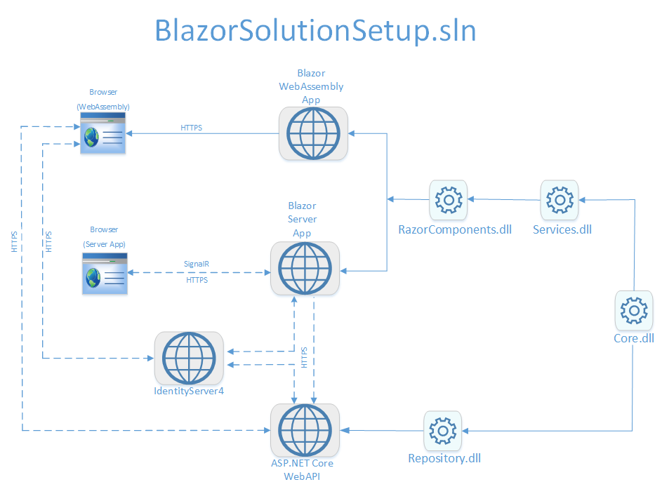 - Blazor Server - where updates and event handling are run on the server and managed over a SignalR connection.