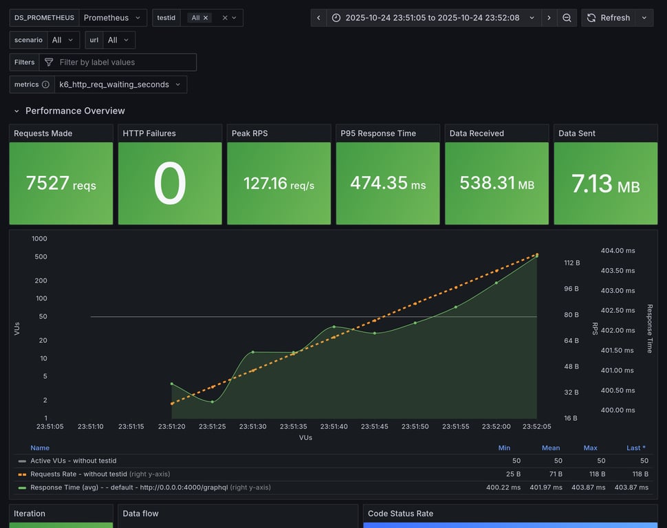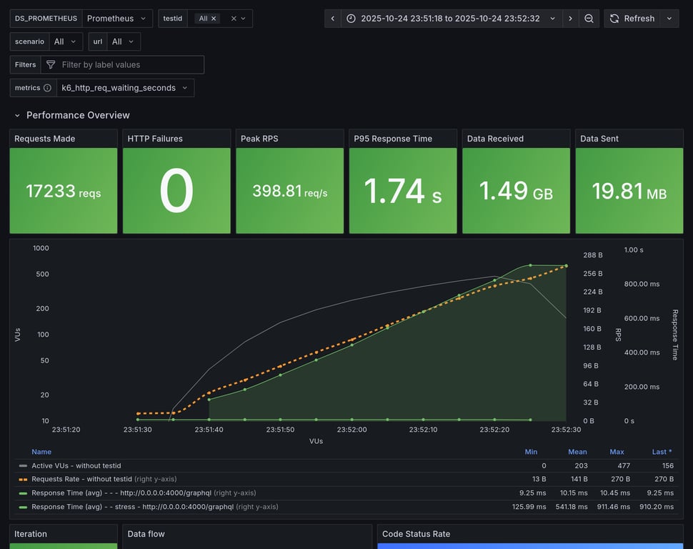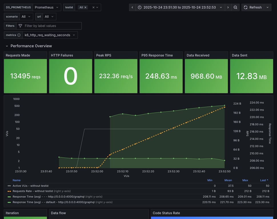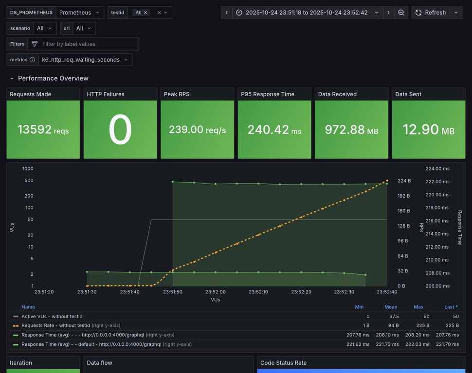 | apollo-router | 396 | 26617 total, 0 failed | avg: 529ms, p95: 1238ms | ❌ 11 unexpected GraphQL errors, non-compatible response structure (1) |