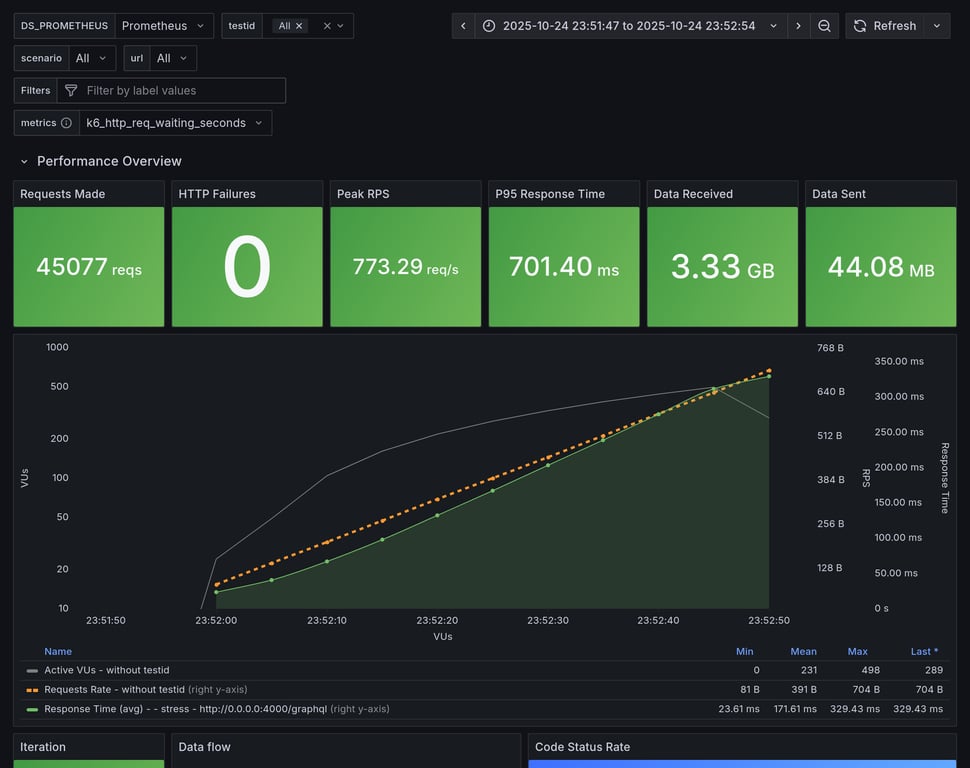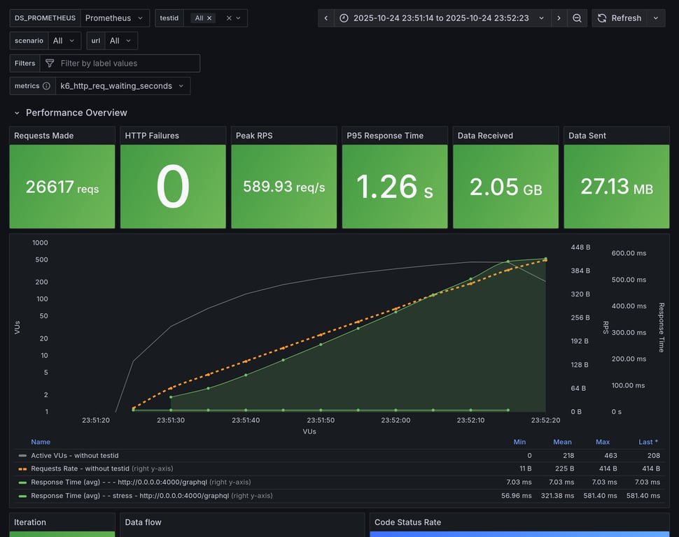 | apollo-gateway | 147 | 10283 total, 0 failed | avg: 1257ms, p95: 2579ms | ✅ |