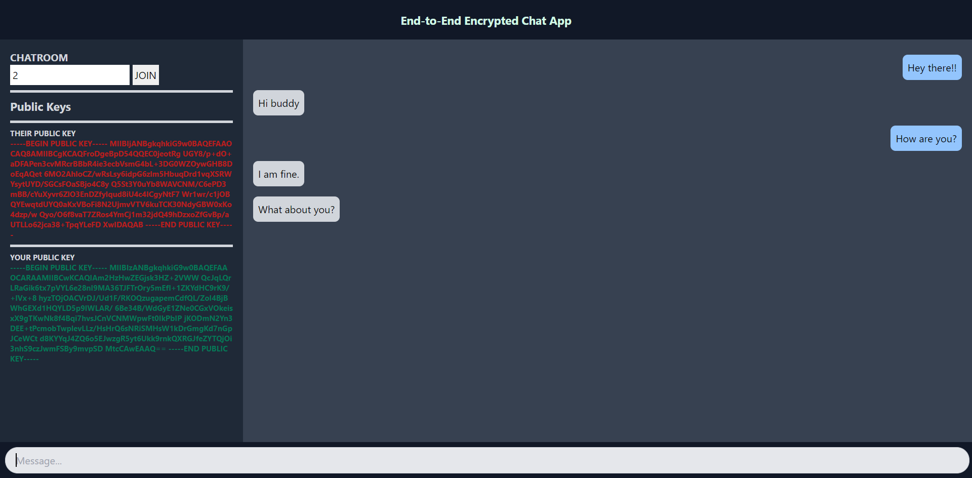 The end-to-end encryption technique is based on the asymmetric cryptography. The sent message is encrypted on the sender's device with the receiver's public key and stays encrypted until it reaches the receiver's device. On the receiver's device, the message is decrypted with the receiver's private key. Using RSA algorithm, in which the public key is generated by multiplying two large prime numbers pp and qq together, and the private key is generated through a different process involving p and q, we built this chat app with the help of a JavaScript library called JSEncrypt. The library, also considered as the as one of the most secure implementations of the RSA encryption algorithm in JavaScript, is the perfect library for our use case as it provides both, enough flexibility and abstraction of functions implemented. Apart from the library, we have used socket.io for key exchange and communication. The public key is exchanged with socket.io while the private key is stored on the device in browser's memory. Because of this, whenever the application is reloaded the previous private key is lost and a new private key is generated.