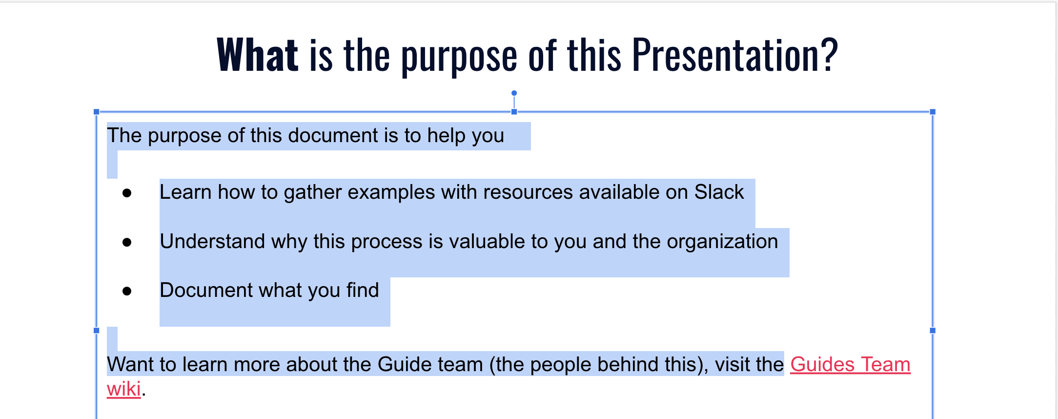 - Highlight all black body text within a slide. If the text is in another color, do not change it to dark blue. See the example here: