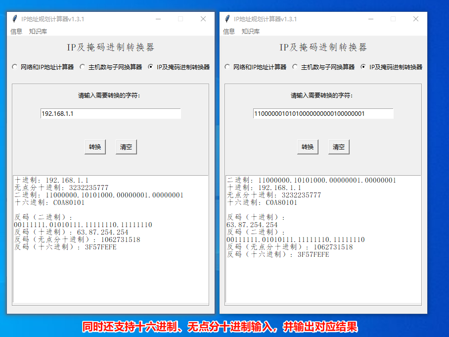 考虑到学习IP地址知识的过程必然会涉及点分十进制、二进制、十六进制的转换,为此特别增加了IP地址和子网掩码的进制转换功能,以满足用户在不同场景下的应急需求。