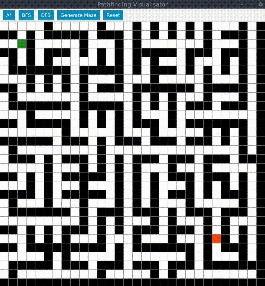 Pathfinding visualizer built in Java using JavaFX library for GUI. Each cell on a grid has its color value which determines its purpose.