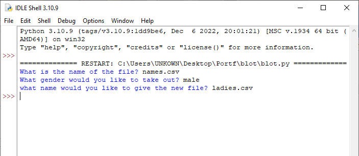 - The user is prompted for the name of the file, gender to blot and name for the new file.