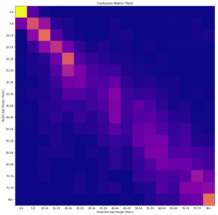 Age Prediction Age prediction with grayscale images. Dataset: https://www.kaggle.com/datasets/nipunarora8/age-gender-and-ethnicity-face-data-csv Me: Confusion Matrix: Some test results: