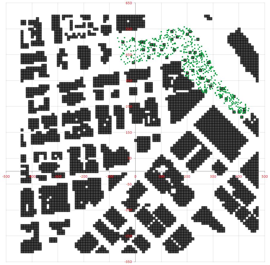 Tested some of the more challenging building courtyards - entrapments - pinchpoint alley-ways where colliders resolution may indicate an embedded area. See Figure 5.