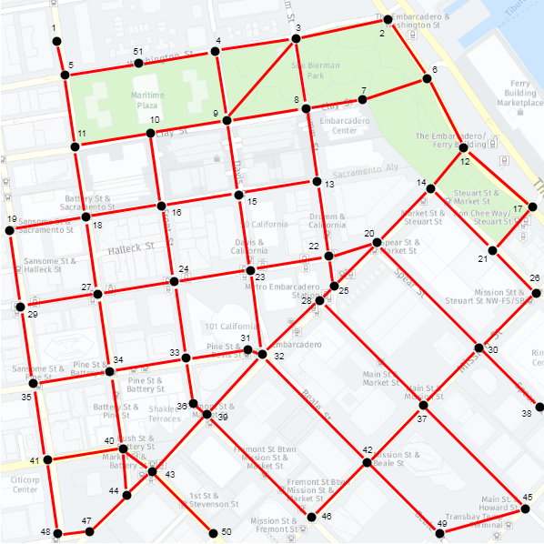 Figure 4: Graph visualization using draw.io. Nodes (black) are major intersections. Edges (red) mostly align with roads.