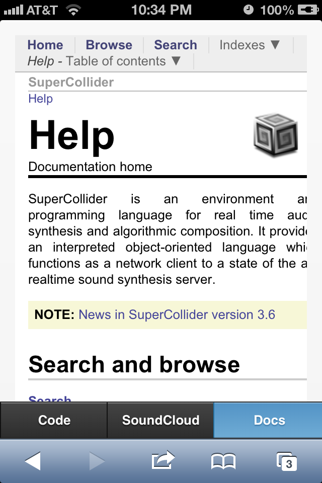 - Realtime interaction with the SuperCollider application via web sockets to facilitate live coding.