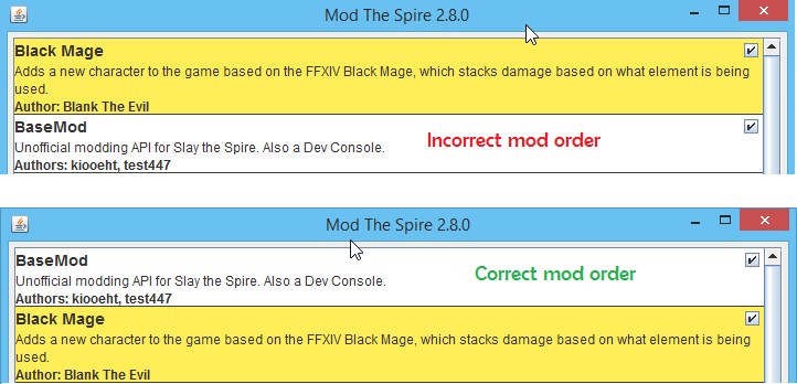 at java.lang.reflect.Method.invoke(Method.java:498)Make sure BaseMod is the first mod in the modlist for ModTheSpire, like so:
