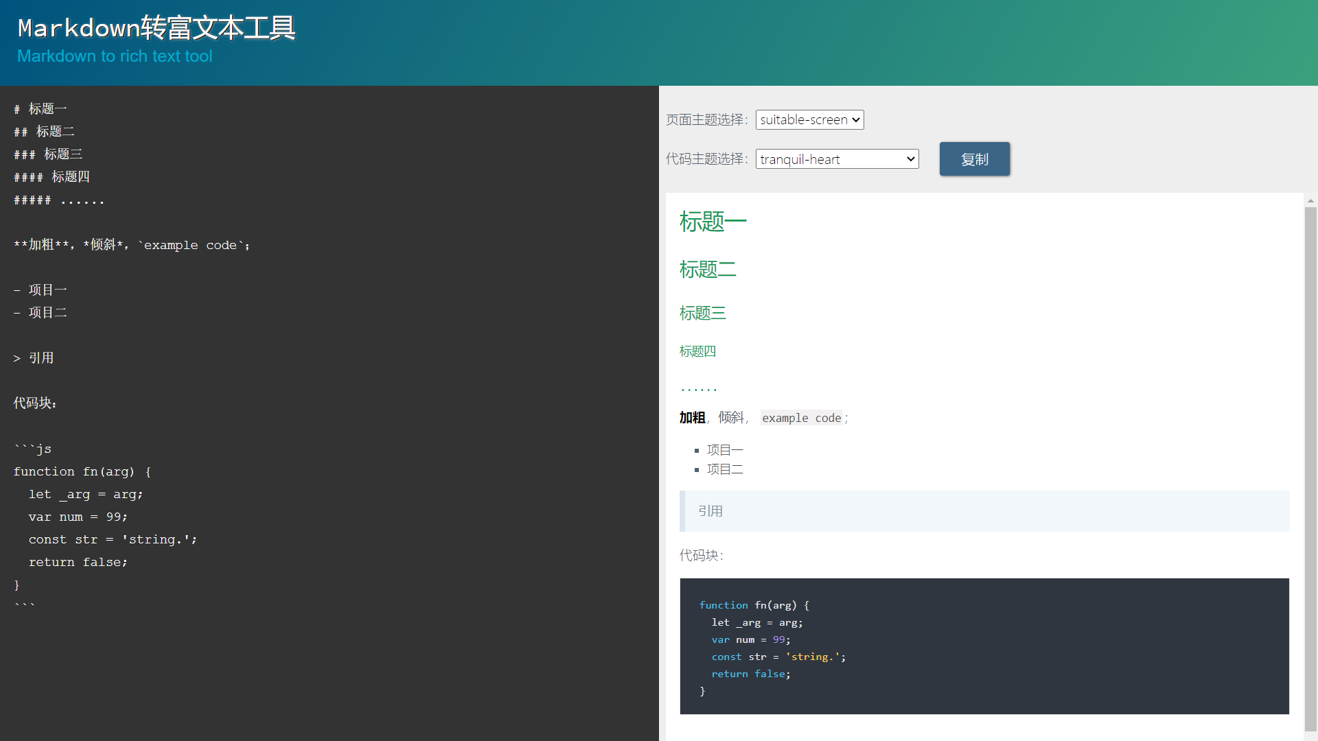 Markdown 转富文本 - 在线工具 Markdown to rich text - Online tool Markdown 转换为富文本格式的工具,即时生成预览,可直接复制富文本至粘贴板。 可用于微信公众号文章排版等场景。 在线转换 预览: