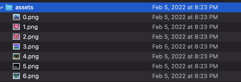 assets/directory. Make sure they are named properly ---0.png,1.png, ... This serves as their NFT id. For now, we only support png and gif files. - Move your metadata (json) into the