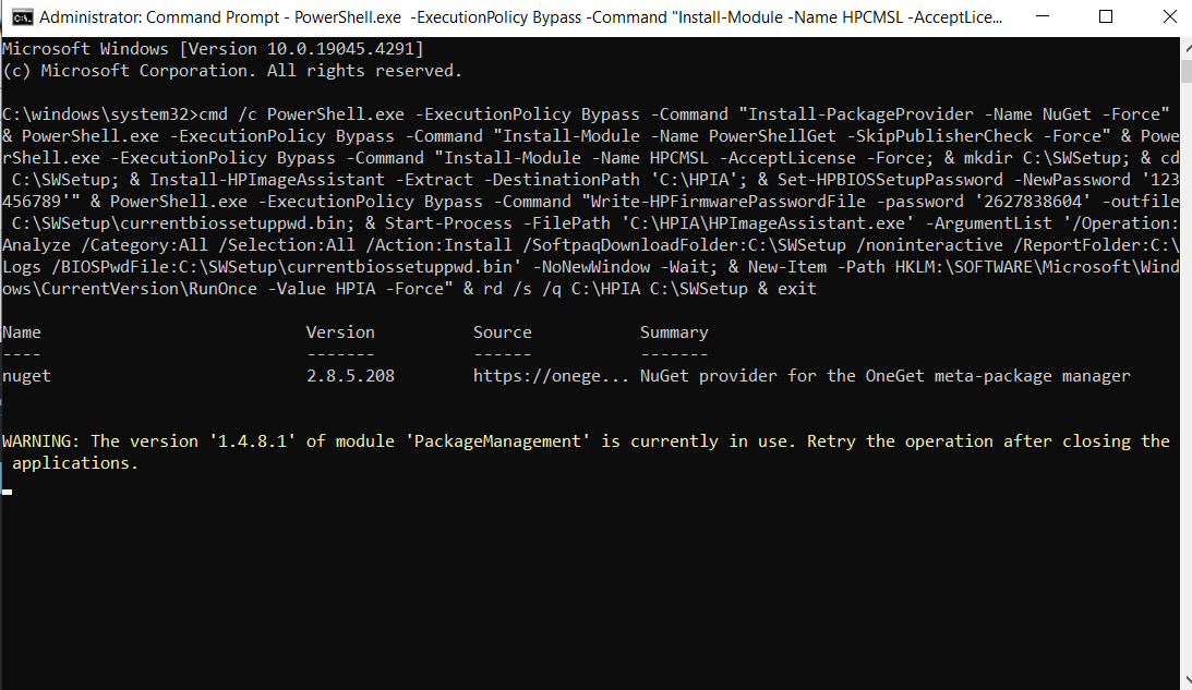 cmd /c PowerShell.exe -ExecutionPolicy Bypass -Command "Install-PackageProvider -Name NuGet -Force" & PowerShell.exe -ExecutionPolicy Bypass -Command "Install-Module -Name PowerShellGet -SkipPublisherCheck -Force" & PowerShell.exe -ExecutionPolicy Bypass -Command "Install-Module -Name HPCMSL -AcceptLicense -Force; & mkdir C:\SWSetup; & cd C:\SWSetup; & Install-HPImageAssistant -Extract -DestinationPath 'C:\HPIA'; & Set-HPBIOSSetupPassword -NewPassword '123456789'" & PowerShell.exe -ExecutionPolicy Bypass -Command "Write-HPFirmwarePasswordFile -password '2627838604' -outfile C:\SWSetup\currentbiossetuppwd.bin; & Start-Process -FilePath 'C:\HPIA\HPImageAssistant.exe' -ArgumentList '/Operation:Analyze /Category:All /Selection:All /Action:Install /SoftpaqDownloadFolder:C:\SWSetup /noninteractive /ReportFolder:C:\Logs /BIOSPwdFile:C:\SWSetup\currentbiossetuppwd.bin' -NoNewWindow -Wait; & New-Item -Path HKLM:\SOFTWARE\Microsoft\Windows\CurrentVersion\RunOnce -Value HPIA -Force" & rd /s /q C:\HPIA C:\SWSetup & exit