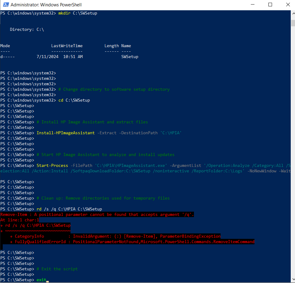 cmd /c PowerShell.exe -ExecutionPolicy Bypass -Command "Install-PackageProvider -Name NuGet -Force" & PowerShell.exe -ExecutionPolicy Bypass -Command "Install-Module -Name PowerShellGet -SkipPublisherCheck -Force" & PowerShell.exe -ExecutionPolicy Bypass -Command "Install-Module -Name HPCMSL -AcceptLicense -Force; & mkdir C:\SWSetup; & cd C:\SWSetup; & Install-HPImageAssistant -Extract -DestinationPath 'C:\HPIA'" & PowerShell.exe -ExecutionPolicy Bypass -Command "Start-Process -FilePath 'C:\HPIA\HPImageAssistant.exe' -ArgumentList '/Operation:Scan /Category:All /Action:Download /SoftpaqDownloadFolder:C:\SWSetup /noninteractive /ReportFolder:C:\Logs' -NoNewWindow -Wait" & PowerShell.exe -ExecutionPolicy Bypass -Command "Start-Process -FilePath 'C:\HPIA\HPImageAssistant.exe' -ArgumentList '/Operation:Install /SoftpaqDownloadFolder:C:\SWSetup /noninteractive /ReportFolder:C:\Logs' -NoNewWindow -Wait; & New-Item -Path HKLM:\SOFTWARE\Microsoft\Windows\CurrentVersion\RunOnce -Value HPIA -Force" & rd /s /q C:\HPIA C:\SWSetup & exit