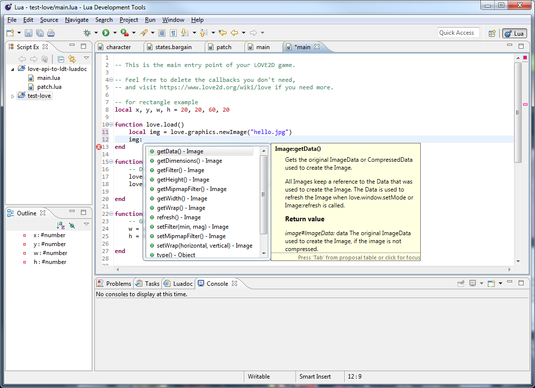 Obviously you will need to have the eclipse LuaDevelopmentTools installed. Also fundamental: A working LOVE2D interpreter. You can use the Execution Environment with eclipse using the default Lua5.1 interpreter or any other, but don't blame me or open an issue if your (well, at least autocompleted) code won't run (Spoiler: It won't). So, please check out the Getting Started pages at the LOVE2D-Wiki and the LDT Wiki on interpreters first.