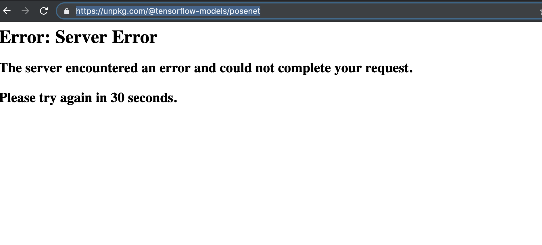 Have a server error to the posenet package that is being sourced in this app. <img width="943" alt="Screen Shot 2019-06-26 at 7 27 48 PM" src="https://user-images.githubusercontent.com/9138420/60224564-91a3a900-9848-11e9-98d1-e18d65f22691.png">