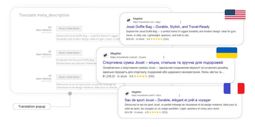 Automatically translate product and category attributes, CMS blocks and pages, Magefan Blog posts, and more, individually or in bulk.