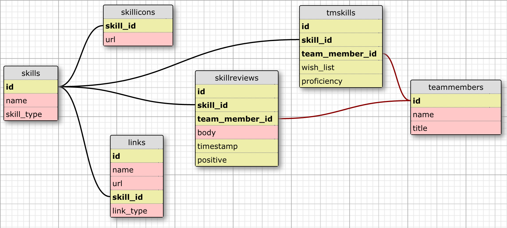 This repo is used to build and run docker images for the skilldirectory and skilldirectoryui projects on a developer's machine or deployed. A Cassandra database image is also run to support the REST API layer, and the schema for that is located in this repo. Below is a visual of the database schema: