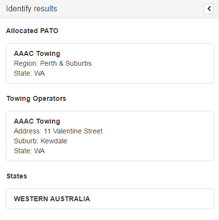 When the Identify tool is activated under the > Tools menu, and the layer is visible, clicking on the map will return the value of the primaryField at the location clicked. The results for all identify-able layers are shown in the pull-out sidebar.