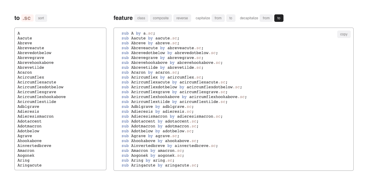SuffixAutomator helps a type developers to reduce repetitive steps when writing simple OpenType features such as one-to-one substitution. It can be useful for writing a Stylistic Set feature, for generating Small Caps receipts, for wrapping characters into classes, for reverse substitution direction, for capitalization or decapitalization source and/or substituted characters, or just for sorting characters.