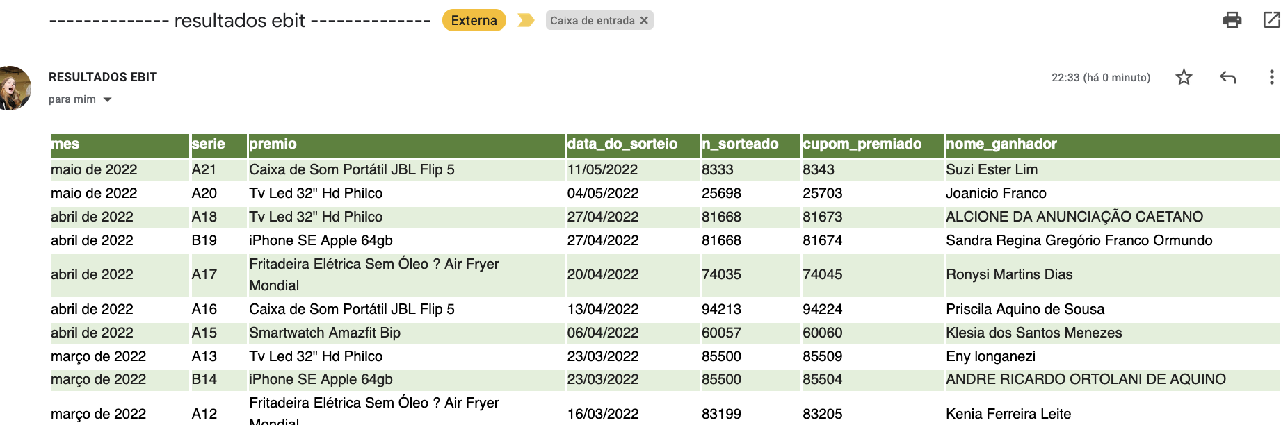 This is a simple webscraping using the classic beautiful soup lib. Then we steal the whole table of winners available in their website, format the table using pretty_html_table lib and mail to you!