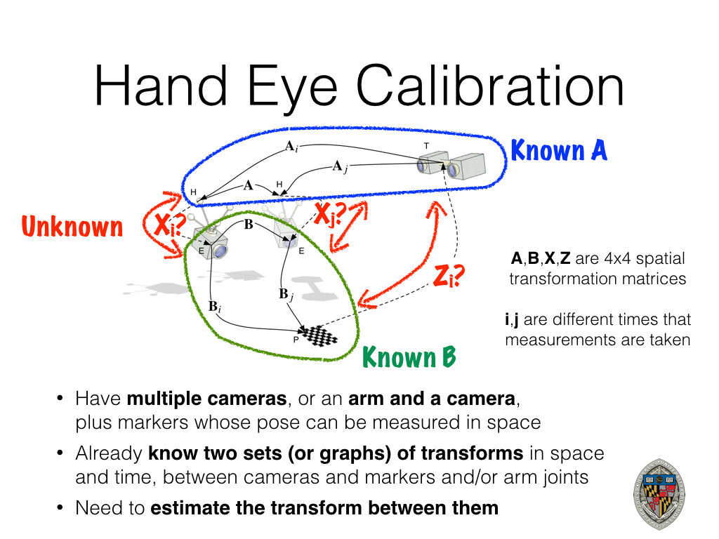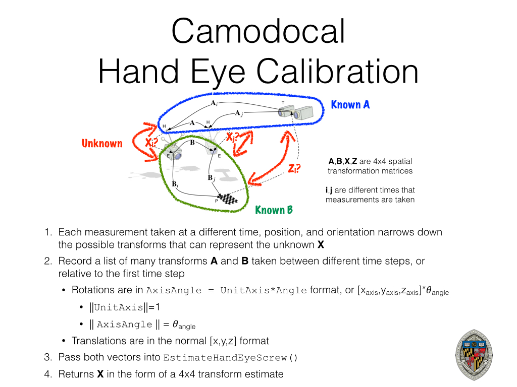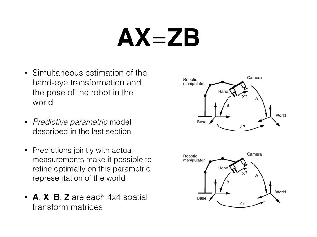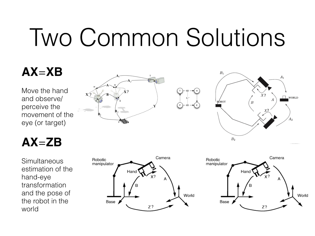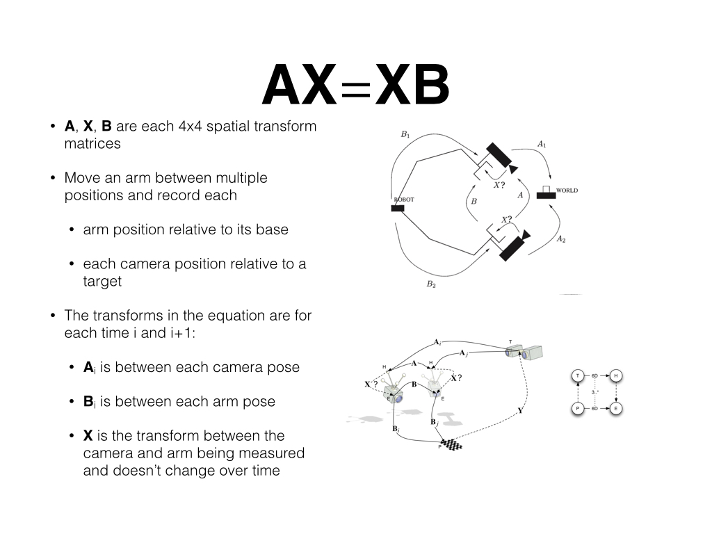 keynote presentation explaining many details about hand eye calibration for those that are interested. Practical code and instructions to calibrate your robot can be found below.