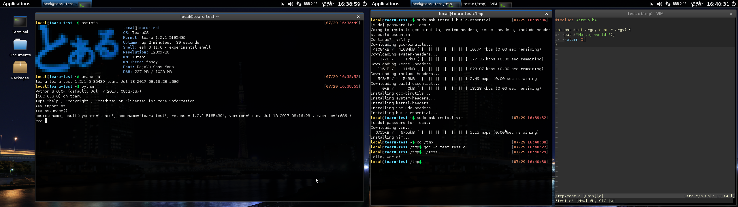 ToaruOS's userspace is focused on a rich graphical environment, backed by an in-house compositing window manager. ToaruOS's terminal emulator supports xterm-compatible 256-color modes, as well as Konsole 24-bit color modes and anti-aliased text with basic Unicode support. Program binaries are dynamically linked. Several graphical demos are provided, alongside a number of command-line applications. A port of SDL targetting the native graphical environment is also available.