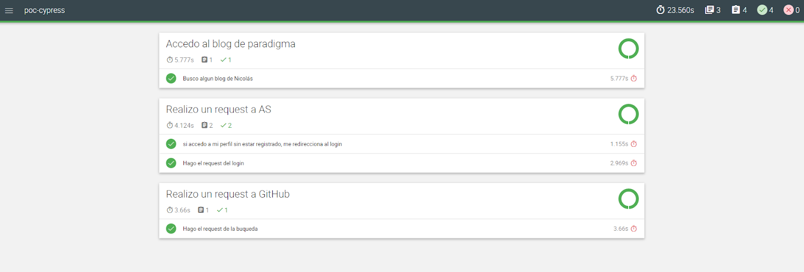 cypress openUna vez abierto, basta con seleccionar el fichero poc_cypress.js para que se ejecuten las pruebas sobre el navegador y genere un reporte.