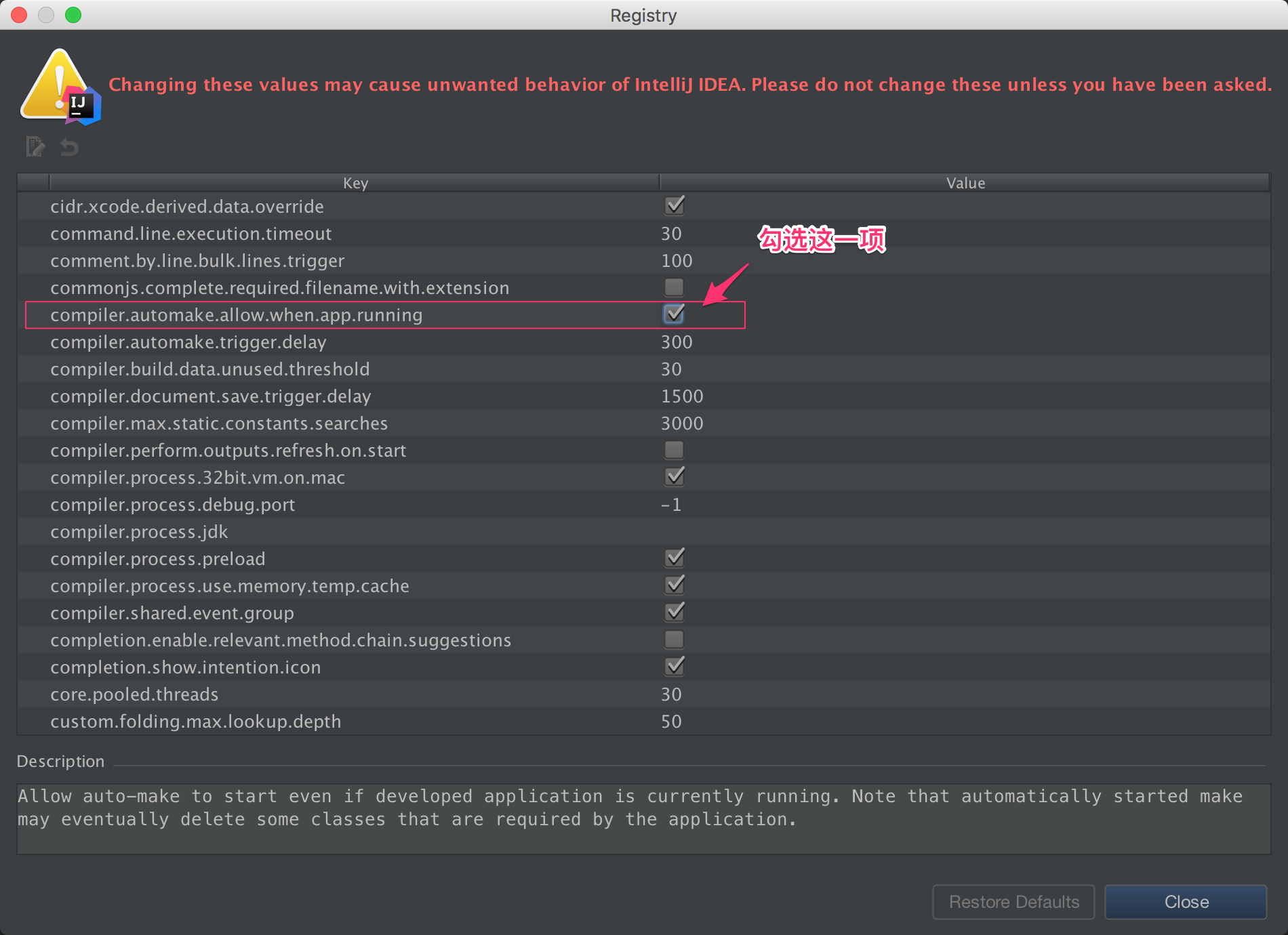 2.找到 “compiler.automake.allow.when.app.running” 这个选项,并且勾选: