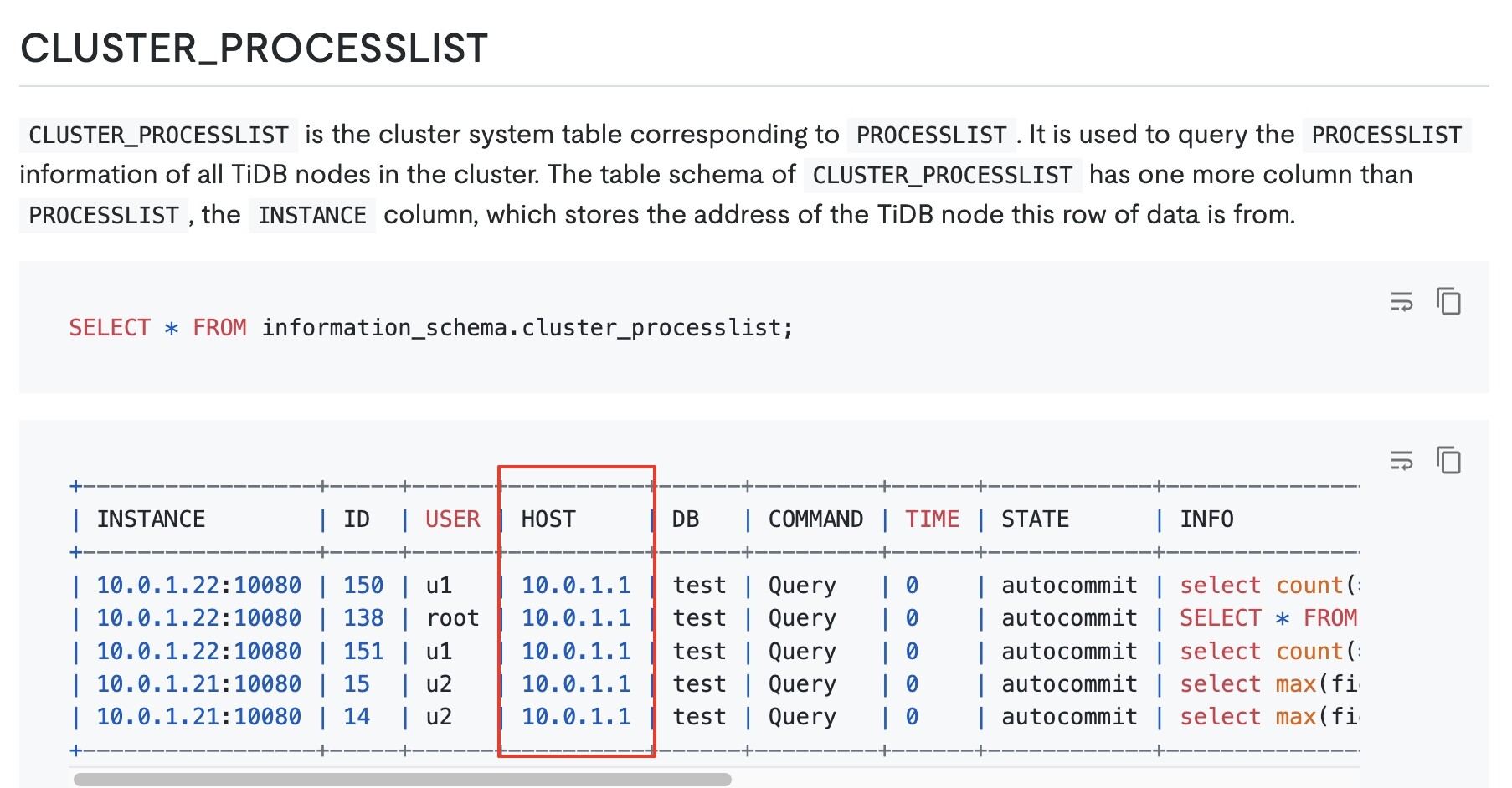 Original author: Hazel Hi @Pranit_Rahangdale You can check the ‘information_schema.cluster_processlist’ system table section in this document. PROCESSLIST. |