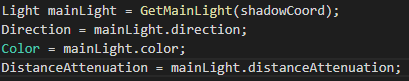The function retrieves the main light's properties using the GetMainLight(shadowCoord) function and stores them in the Direction, Color, and DistanceAttenuation variables.