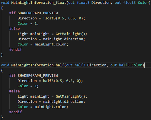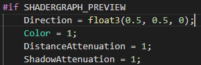A float3 representing the world position, the distance attenuation DistanceAttenuation, and the shadow attenuation ShadowAttenuation was added. Additionally, an If SHADERGRAPH_PREVIEW is defined, the function sets all output values to default values.