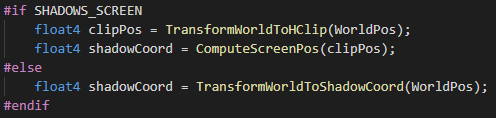 If SHADOWS_SCREEN is defined, the function calculates the clip position and shadow coordinates based on the screen position. Otherwise, it calculates the shadow coordinates based on the world position. These pieces of code are used to control the lighting and shadowing effects in the shader.