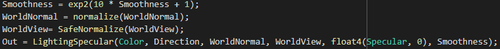 Else If the shader is not being previewed in Shader Graph, the function calculates the specular lighting based on the input parameters. First, the Smoothness value is transformed using an exponential function to increase its range. Then, the WorldNormal and WorldView vectors are normalized to ensure they have a length of 1. Finally, the LightingSpecular function is called to calculate the specular lighting based on the light color, light direction, surface normal, view direction, specular color, and smoothness. The result is stored in the Out variable.