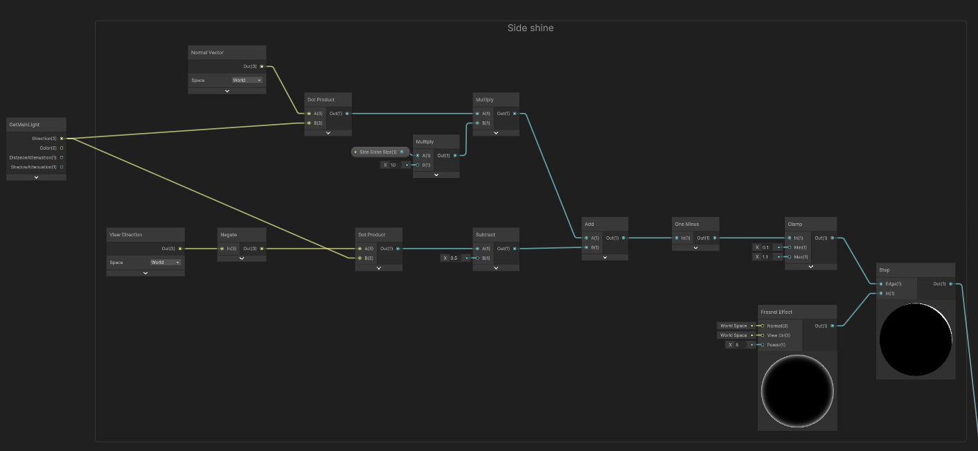 It illuminates the side being lit by the light at the brightest point of the lighting model. Two factors control the brightness of this shine. One is the dot product of the view direction in inverted world space and the light direction, which is then multiplied by the desired size multiplied by 10. This multiplication by 10 scales the desired size to a larger number, allowing the parameter to be adjusted between 0 and 1 by the user. The other factor is the dot product of the world normal with the light direction, which is then subtracted by 0.5. This subtraction makes the side shine smaller and more practical for the user-defined size of the side shine. These two factors are added together to calculate how much we see the Fresnel Effect. A "one minus" operation is then used to invert the value, making it negative and thus directing the shine toward the light instead of against it. A clamp function is applied to prevent these values from exceeding the range of 0.1 to 1.1. All of this is then subjected to a step function between the previous calculations and a Fresnel Effect. This light effect becomes noticeable when viewing the model from a slightly off-center angle.