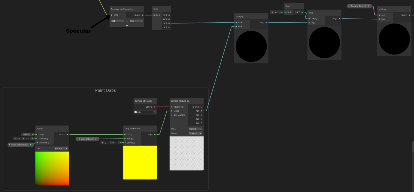 This effect is designed to make the specular component appear as if it were painted with a brush. Essentially, a texture with repeating lines is used, allowing the adjustment of the number of lines and their rotation. The specular is converted from RGB to HSV, and the blue component is employed to multiply the red RGB values from the texture. This multiplication achieves color blending, modulating the intensity of specular highlights and ensuring a unified and harmonized combination of colors in the final output. Following this, the result of the multiplication undergoes a step function at a certain point to distinguish what is white, and the rest is black. Finally, it is multiplied by the color of the specular, which can be adjusted by the user within the editor.